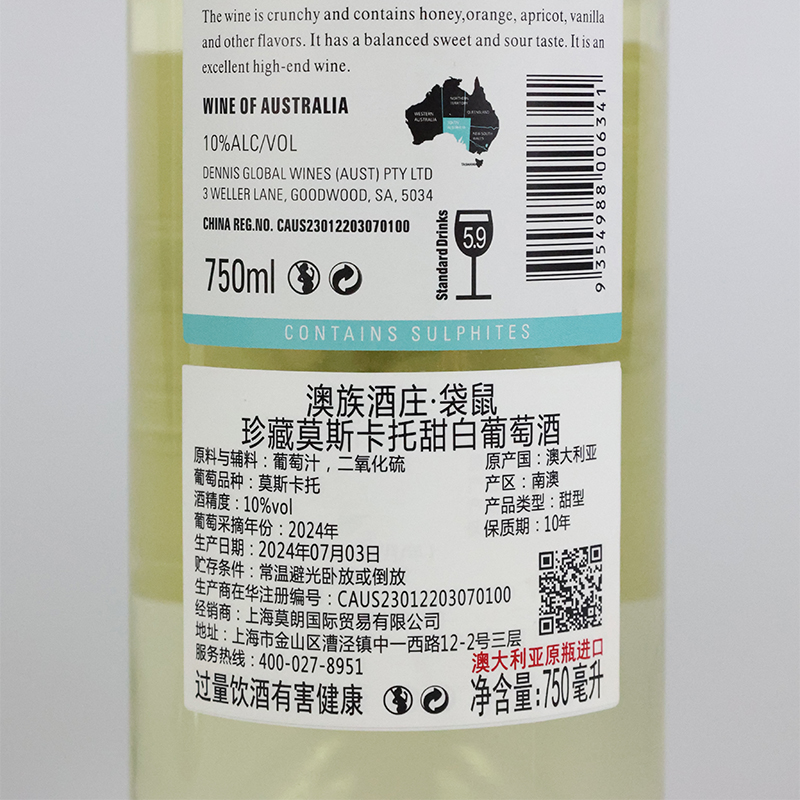 商品名称:澳族酒庄袋鼠珍藏莫斯卡托甜白