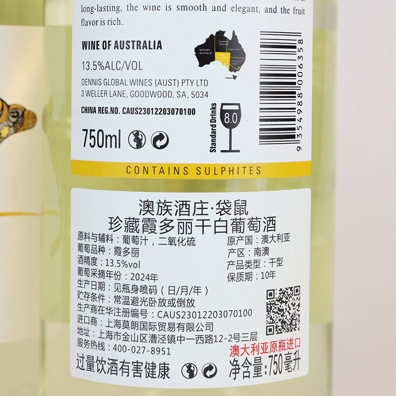 商品名称:澳族酒庄袋鼠珍藏霞多丽干白