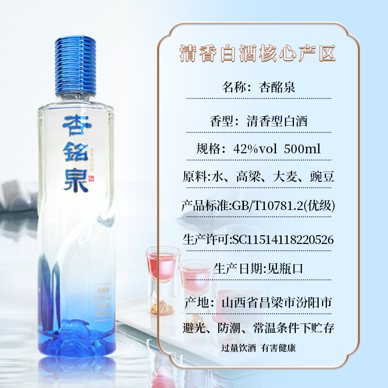 山西杏花村 杏铭泉 杏铭泉 清香型白酒 42度 500ml*6瓶 整箱