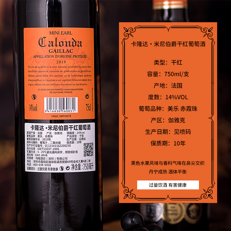 商品名称:卡隆达 米尼伯爵干红葡萄酒